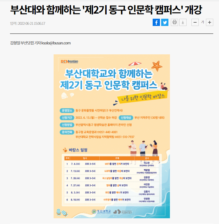 [언론보도] 부산대와 함께하는 '제2기 동구 인문학 캠퍼스' 개강